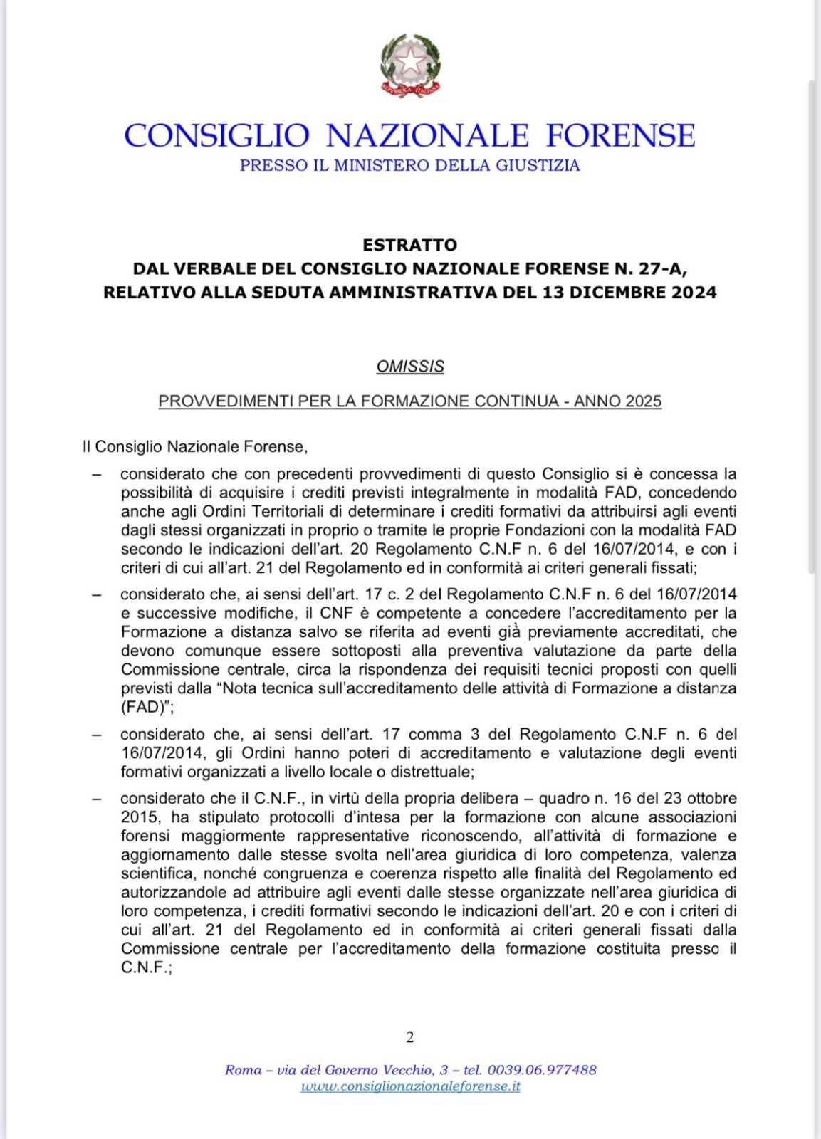 Confermato anche per il 2025 il conseguimento di n. 15 crediti formativi di cui n. 3 in materia di deontologia.